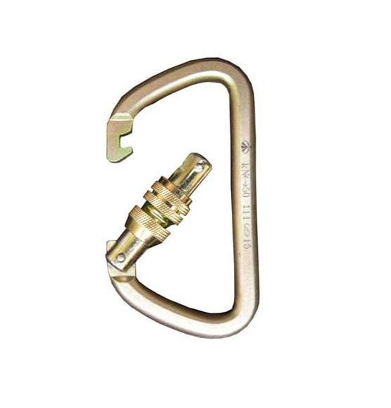Карабин трапеция стальной Вертикаль российского производства имеет цинковое покрытие желтого цвета. Трапециевидная форма способствует правильному распределению нагрузки вдоль продольной оси, за счет чего это устройство легче овальных карабинов той же грузоподъемности. Приспособление оснащено резьбовой запирающей муфтой, повышающей его надежность. Изделие весит 180 г, раскрытие защелки достигает 23 мм. Сферы применения – высотные и спасательные работы. Пиковые нагрузки: продольная – 5 000 кг, поперечная – 1100 кг, при открытой муфте – 1500 кг.
