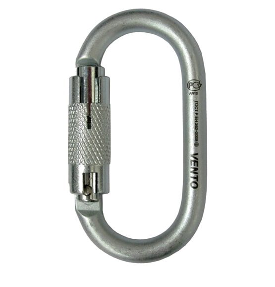 Карабин российского производителя Венто «Стальной овал автомат» изготовлен из оцинкованной стали. Овальная форма обеспечивает хорошую подвижность при пристегивании и равномерное распределение нагрузки. Устройство оснащено запирающей системой Keylock и автоматической муфтой, благодаря чему его можно быстро пристегивать одной рукой. Ширина раскрытия защелки составляет 16 мм, вес изделия – 190 г. Этот карабин применяется при высотных и спасательных работах. Максимально допустимые нагрузки: продольная – 2500 кг, поперечная –700 кг, с расстегнутой муфтой – 700 кг.